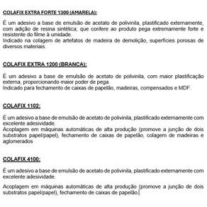 O Colafix é um adesivo industrial à base de emulsão de acetato de polivinila (PVA), plastificado externamente, desenvolvido para aplicações que exigem alta adesividade e desempenho em processos automatizados. Ele é amplamente utilizado no fechamento automático de caixas de papelão em linhas de produção de alta velocidade, garantindo uma colagem rápida e resistente. Além disso, é eficaz na junção de substratos de papel/papel, sendo ideal para encadernação, montagem de embalagens e processos gráficos. Também pode ser aplicado na colagem de madeiras e aglomerados, como MDF e compensados, proporcionando uma fixação duradouda e flexível após a secagem. Sua formulação permite uma boa adaptação em máquinas automáticas de aplicação, como sistemas de rolo ou cola quente, mantendo uma adesão consistente mesmo em condições de produção intensiva. Por suas características, é uma opção versátil para indústrias de embalagens, moveleiras e gráficas que necessitam de um adesivo eficiente, de rápida aplicação e com excelente resistência após a cura. É um adesivo à base de emulsão de acetato de polivinila, com maior plastificação externa, proporcionando maior poder de pega. Indicado para fechamento de caixas de papelão, madeiras, compensados e MDF.