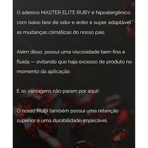 - Baixo Odor e Ardor: Durante a aplicação, a Cola Ruby Elite Master proporciona conforto com seu baixo odor e ardor.