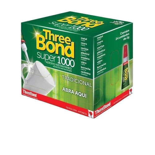A cola three bond super 1000 é um adesivo instantâneo ideal para aderir diversos tipos de materiais, tais como: madeira, couro, cerâmica, metal, borracha, cortiça, vidros e plásticos A cola three bond super 1000 não colam plásticos tipo: polietileno, polipropileno, politetrafluoretileno e silicone Modo de usar: limpe as superfícies a serem coladas removendo quaisquer espécies de sujeira, oleosidade, umidade, etc. Para romper o lacre, com a tampa vermelha fechada rosquea até que se rompe o lacre.