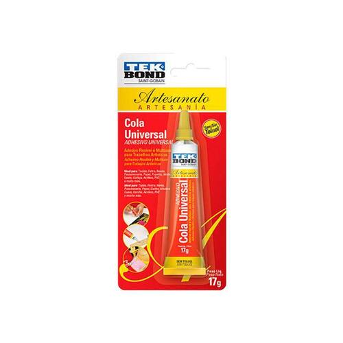 Cola Universal 17g com 12 Unidades-TEKBOND-14201007004 É indicado para união de vários substratos tecido, madeira balsa, "eucatex", MDF, cortiça, papel, papelão, papel cartão, acrílico, couro, PVC, madeira eucalipto, pinus, renda e outros . É super resistente à água e óleos convencionais. Proporciona montagens e colagens de alto desempenho com qualidade, oferecendo excelente resistência à desmontagem. - Características: :: É uma cola transparente, viscosa, feita a partir de copolímero de borracha sintética especial com grande desempenho após curado. - Modo de Uso: :: Para obter um resultado satisfatório, as superfícies devem estar limpas, isentas de óleo e sujeira. :: Deve-se aplicar uma camada fina de adesivo em apenas 1 um dos substratos a serem colados, pois o excesso prejudica o bom desempenho da colagem. :: Após aplicação do adesivo, aguarde pela evaporação dos solventes. - Precauções::: Mantenha fora do alcance de crianças. Mantenha o produto armazenado em local fresco, seco e ao abrigo de luz solar direta ou fontes de ignição. - Dados Técnicos::: Viscosidade cP : 10. 000 a 13. 000:: Temperatura de Trabalho °C : -20 a 80:: Tempo de formação de película: 1 a 5 minutos:: Teor de sólidos: 45%:: Resistência ao Cisalhamento Aço x Aço : = 45Kgf/cm2- Garantia: 6 meses- Marca: TEKBOND Ean: 7898543381747