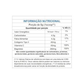 Alguns Benefícios: /- Ajuda na recomposição da cartilagem - Ação antioxidante e anti-inflamatório - Manutenção do sistema articular e cartilaginoso - Melhora a flexibilidade e mobilidade - 40mg de colágeno tipo II por porção - Lubrificação das articulações - Auxilia na redução da inflamação da articulação - Alto teor de Vitamina C e Magnésio - Pode reduzir dores nos joelhos, costas, mandíbula e articulações - Ajuda a combater muitos tipos de artrite