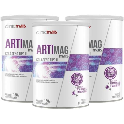kit com 3 frascos de Colágeno Artimag Tipo 2 UC-II 40mg por porção pote com 150g / O Colágeno tipo 2 é uma proteína estrutural presente na cartilagem que é essencial para a formação, resistência e rigidez do tecido cartilaginoso. É o principal colágeno fibroso da cartilagem, representando 80-90% do colágeno neste tecido. A importância do colágeno tipo 2 está em sua capacidade de auxiliar na regeneração da cartilagem enfraquecida. Sem a qualidade adequada da cartilagem e sem a lubrificação do ácido hialurônico, as juntas acabam encostando uma na outra, podendo causar uma variedade de problemas relacionados à dor e inflamação. Qual é a diferença entre colágeno Tipo I e Tipo II /O colágeno Tipo I é encontrado nos ossos e na pele. Bom para o osso e é o principal componente da pele, tendões e ligamentos. O colágeno Tipo II é o principal colágeno da cartilagem e essencial para as articulações. Alguns Benefícios: /- Ajuda na recomposição da cartilagem - Ação antioxidante e - Manutenção do sistema articular e cartilaginoso - Melhora a flexibilidade e mobilidade - 40mg de colágeno tipo II por porção - Lubrificação das articulações - Auxilia na redução da inflamação da articulação - Alto teor de Vitamina C e Magnésio - Pode reduzir dores nos joelhos, costas, mandíbula e articulações - Ajuda a combater muitos tipos de artrite Ingredientes: olidextrose, magnésio óxido de magnésio , antiumectante dióxido de silício, vitamina C, colágeno tipo II, edulcorante sucralose. Sugestão de Consumo: /Adicione 1 scoop raso 5 gramas em um copo com 150ml de água e mexa até a dissolução completa do produto. Consuma logo após o preparo. Ingerir 1 vez ao dia ou, de acordo com recomendação de médico ou nutricionista. Atenção:/ Pessoas que apresentem doenças ou alterações fisiológicas, crianças, mulheres grávidas ou amamentando e idosos deverão consultar o médico ou nutricionista antes de usar o produto. Não contém glúten, sódio e adição de açúcares. Pode conter traços de soja e/ou leite. Marca: Não Informado