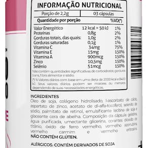 Colágeno hidrolisado supreme + vitaminas 90cps fitoprime Ingredientes: Óleo de soja, colágeno hidrolisado, l-ascorbato de cálcio, aspartato de zinco, acetato de dl-alfa-tocoferol, selenito de sódio, palmitato de retinol, emulsificante lecitina de soja e glaceante cera de abelha. Composição da cápsula: gelatina, água purificada, umectante glicerina, corantes dióxido de titânio, óxido de ferro vermelho, vermelho azorrubina, vermelho carmim e vermelho eritrosina. Não contém glúten Alérgicos: contém derivados de soja Não contém glúten Sugestão de uso: Ingerir 3 cápsulas ao dia. Conservação: Conservar ao abrigo da luz, calor e umidade. Após aberto consumir em até 60 dias. Dispensado de registro conforme rdc 240/2018