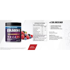 Ingredientes: Colágeno hidrolisado, maltodextrina, metilsulfonilmetano, hialuronato de sódio e coenzima q10. Acidulante ácido cítrico, aroma natural, corante carmim e antiumectante dióxido de silício e edulcorantes artificial sucralose e natural glicosídeos de esteviol. Não contém glúten.