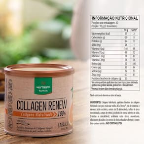 Collagen Renew Nutrify é um suplemento alimentar em pó formulado com peptídeos bioativos de colágeno Verisol , além de vitaminas e minerais que atuam em sinergia com o colágeno. Indicado para adultos a partir dos 19 anos que desejam cuidar da saúde da pele e promover a beleza natural. Um bom momento para ingeri-lo pode ser antes de dormir, quando seu corpo está em repouso e poderá absorver os nutrientes de maneira mais tranquila e eficiente ou em jejum pela manhã. - Como tomar Adicione 10g 2 scoops em aproximadamente 200ml 1 copo de água. Misture até a total homogeneização. Beba imediatamente após o preparo. Recomenda-se o uso uma vez ao dia ou conforme orientação profissional. - Ingredientes Colágeno hidrolisado, peptídeos bioativos de colágeno hidrolisado com peso molecular médio 2kDa Verisol , mix de vitaminas e minerais ácido ascórbico, acetato de DL-alfatocoferila, sulfato de zinco monoidratado, acetato de retinol, picolinato de cromo, selenito de sódio, D-biotina e colecalciferol , acidulante ácido cítrico, aromatizante, edulcorante glicosídeos de esteviol de Stevia rebaudiana Bertoni e corante beta-caroteno sintético.