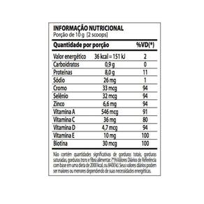 Colágeno hidrolisado, colágeno hidrolisado bioativo (Verisol), mix de vitaminas e minerais [vitamina C (ácido ascórbico), vitamina E (DL alfa de tocoferol), zinco (sulfato de zinco mono-hidratado), vitamina A (acetato de retinol), cromo (picolinato de cromo), selênio (selenito de sódio), vitamina H (biotina) e vitamina D (colecalciferol)] e estévia (edulcorante).