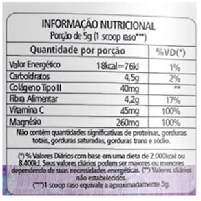 Polidextrose, magnésio (óxido de magnésio), antiumectante dióxido de silício, vitamina C (ácido ascórbico), colágeno tipo II, edulcorante sucralose. NÃO CONTÉM GLÚTEN. ALÉRGICOS: PODE CONTER TRAÇOS DE SOJA E/OU LEITE.