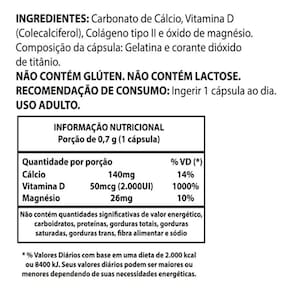 Carbonato de Cálcio, Vitamina D Colecalciferol , Colágeno Tipo II, e óxido de magnésio.