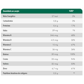 Colágeno hidrolisado, peptídeos bioativos de colágeno hidrolisado com peso molecular médio 2kDa (Verisol®), cacau em pó, mix de vitaminas e minerais (ácido ascórbico, acetato de DL-alfatocoferila, sulfato de zinco monoidratado, acetato de retinol, picolinato de cromo, selenito de sódio, D-biotina e colecalciferol), aromatizante e edulcorante glicosídeos de esteviol de Stevia rebaudiana Bertoni. NÃO CONTÉM GLÚTEN.
