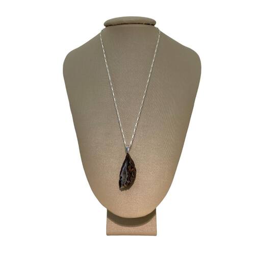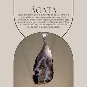 O pingente de Geodo de Ágata revela uma beleza natural crua, com sua superfície polida que encerra camadas de cores terrosas e cavidades cristalinas resplandecentes.