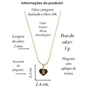 Colar feminino modelo Cartier com pingente Coração negro letra inicial E banhado em Ouro 18k. Delicado e cheio de significado, este colar apresenta um pingente em forma de coração, personalizado com a letra inicial. O colar perfeito para quem deseja manter alguém especial sempre perto do coração. Ideal para presentear ou para adicionar um toque pessoal ao seu estilo diário. Este colar banhado a Ouro é mais que um acessório; é uma declaração de amor. Especificações: Colar Cartier com pingente Coração Negro letra inicia E banhados em Ouro 18k. Tamanho do colar: 50 cm. Peso do colar: 3 g. Espessura do colar: 2 mm. Fecho do colar: lagosta. Antialérgico. Tamanho do pingente: 1,4 x 1,2 cm. Pingente banhado a Ouro com aplique de resina branca. Instruções de uso e conservação: Nossas peças são de excelente qualidade. Para manter o brilho e a beleza da joia; por favor siga estas dicas: Evite o uso da joia durante o banho, ter atenção ao aplique de cremes ou perfumes sobre a joia, evitar banho de piscina e mar com a joia; limpe-as sempre com flanela adequada, guarde-as separadamente. Com estes cuidados básicos a joia manterá sempre a originalidade e qualidade. Acompanha linda caixinha de presentes. sobre defeitos de fabricação: 6 meses. Seguindo nossas orientações de uso no certificado de , a joia permanecerá conservada por longos anos ou até décadas Marca: Anaisa Semijoias