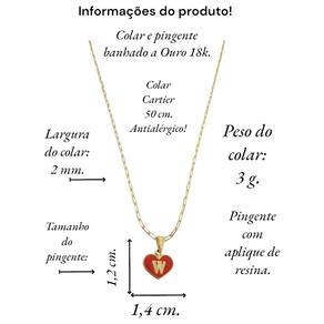 Colar feminino modelo Cartier com pingente Coração Vermelho letra inicial W banhado em Ouro 18k. Delicado e cheio de significado, este colar apresenta um pingente em forma de coração, personalizado com a letra inicial. O colar perfeito para quem deseja manter alguém especial sempre perto do coração. Ideal para presentear ou para adicionar um toque pessoal ao seu estilo diário. Este colar banhado a Ouro é mais que um acessório; é uma declaração de amor. Especificações: Colar Cartier com pingente Coração Vermelho letra inicia W banhados em Ouro 18k. Tamanho do colar: 50 cm. Peso do colar: 3 g. Espessura do colar: 2 mm. Fecho do colar: lagosta. Antialérgico. Tamanho do pingente: 1,4 x 1,2 cm. Pingente banhado a Ouro com aplique de resina branca. Instruções de uso e conservação: Nossas peças são de excelente qualidade. Para manter o brilho e a beleza da joia; por favor siga estas dicas: Evite o uso da joia durante o banho, ter atenção ao aplique de cremes ou perfumes sobre a joia, evitar banho de piscina e mar com a joia; limpe-as sempre com flanela adequada, guarde-as separadamente. Com estes cuidados básicos a joia manterá sempre a originalidade e qualidade. Acompanha linda caixinha de presentes. sobre defeitos de fabricação: 6 meses. Seguindo nossas orientações de uso no certificado de , a joia permanecerá conservada por longos anos ou até décadas Marca: Anaisa Semijoias