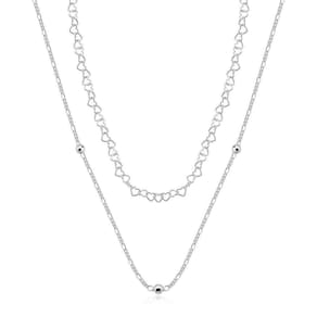 Colar minimalista em Prata 925 com um design elegante e moderno que combina duas delicadas correntes em um único acessório. A primeira corrente apresenta um sofisticado padrão de corações interligados, trazendo um toque romântico e jovial ao visual. A segunda corrente é lisa, complementada por detalhes sutis que adicionam brilho e versatilidade à peça.