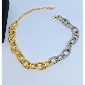 DADOS TÉCNICOSMedidas do Choker:Elos da Corrente : quadrado Duplo Dourado com Prata Material ; Metal Folheado com verniz cataforético Genero: feminino Comprimento: 40CmCom Extensor: 5CmDiâmetro: 3,5mmFecho: boia
