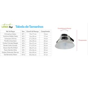As referências de medidas de circunferência do pescoço e comprimento da coleira ao focinho na lateral são aproximadas, devido à variação acentuada do porte físico dos animais.