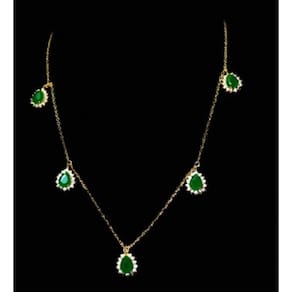 Colar com pedras Zircônia na cor Esmeralda folheado a Ouro 18k. Colar maravilhoso para todas as ocasiões em que você quiser desfrutar da vida noturna ou quando precisar de um charme extra. O destaque deste colar fica por conta dos 5 pingentes com pedras zircônia na cor Esmeralda que dá um toque especial de sofisticação e elegância. O formato ao redor dos corações formam um contorno de raios navetes. Você pode fazer diversas combinações, basta conferir as mais variadas peças em nosso site para arrasar. Dados Técnicos: Marca: Visujóias Pedra: Zircônia na cor Esmeralda com Navetes ao redor de todos os pingentes. Comprimento: 60 Cm Quantidade de pingentes: 5 Pingentes em formato de gota. Peso: 7 Gramas. Folheação: Ouro 18K : De 6 meses quanto a folheação e de 1 ano para defeitos provenientes de fabricação. Todas as peças possuem tratamento antialérgico Marca: Não Informado
