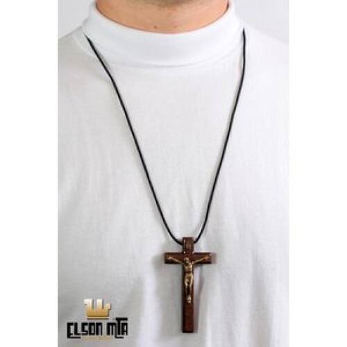 Colar de elástico poliéster cor preta, com pingente de Cruz construído em MDF (derivado de madeira) acabamento em imbuia envernizado, proporcionando alto brilho e impermeabilidade e Cristo feito em metal. Tamanho da Cruz: altura 8 cm; largura 4 cm Diâmetro total do cordão: 25 cm Marca: Elson MTA - Arte Sacra