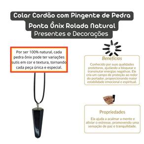 Colar Cordão com Pingente de Pedra Ponta Ônix Rolada Natural Colar com Pingente de Pedra Ponta Ônix Rolada Natural Todos os Cristais são de origem natural, por essa razão, apresentam variações de cor e tamanhos e por serem pedras naturais podem conter fissuras, ranhuras, veios e outros em razão do processo de extração, porém todos mantém excelente qualidade Pedra Ônix: A principal característica da pedra ônix é sua capacidade de proteção. Ela cria uma barreira contra energias negativas e ajuda a afastar influências indesejadas, tornando-a uma excelente pedra para quem busca uma proteção constante no seu ambiente pessoal. A ônix é conhecida por promover a estabilidade emocional. Ela pode ajudar a controlar o , a ansiedade e as emoções intensas, trazendo um estado de calma e equilíbrio interior. Enviamos o seu pedido em até 24 horas após a confirmação do produto Caso tenha alguma dúvida nos mande mensagem responderemos rapidinho para te ajuda da melhor forma possível Marca: Meta Atacado