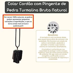 Colar Cordão com Pingente de Pedra Turmalina Bruta Natural Colar Cordão com Pingente de Pedra Turmalina Bruta Natural Este colar com cordão e pingente de pedra turmalina bruta natural é uma peça única e cheia de poder. A turmalina é conhecida por suas propriedades protetoras e curativas, sendo ideal para quem busca proteção energética, equilíbrio emocional e fortalecimento da aura. O formato bruto da pedra traz um charme rústico e autêntico, tornando cada peça ainda mais especial e cheia de personalidade. Benefícios Energéticos da Turmalina: Proteção Energética e Purificação: A turmalina é uma das pedras mais poderosas para proteção, sendo eficaz para bloquear e transmutar energias negativas. Ela ajuda a criar um escudo energético ao redor do portador, proporcionando proteção em ambientes e situações desafiadoras. Equilíbrio e Harmonia Emocional: Esta pedra é excelente para equilibrar as emoções e trazer clareza mental. Ela ajuda a aliviar , ansiedade e outros bloqueios emocionais, promovendo uma sensação de tranquilidade, equilíbrio e paz interior. Enviamos em até 24 horas após a confirmação do pagamento Marca: Não Informado
