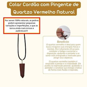 Colar Cordão com Pingente Quartzo Vermelho Natural Colar Cordão com Pingente de Quartzo Vermelho Natural Este colar com cordão e pingente de quartzo vermelho natural é uma peça impressionante que combina a beleza vibrante do quartzo vermelho com suas poderosas propriedades energéticas. O quartzo vermelho é uma pedra de força e vitalidade, conhecida por estimular a energia física, a coragem e a paixão. Ao ser Utilizado como pingente, ele não só adiciona um toque elegante ao visual, mas também serve como um amuleto que promove motivação, equilíbrio e autoconfiança. Benefícios Energéticos: Aumento de Energia e Vitalidade: O quartzo vermelho é ideal para quem busca revigorar suas energias físicas e mentais. Ele é altamente eficaz para combater a fadiga e aumentar a disposição, ajudando o portador a se sentir mais energizado e motivado para atingir seus objetivos. Estímulo à Coragem e Confiança: Esta pedra é conhecida por fortalecer a coragem e a confiança, ajudando o portador a tomar decisões com mais assertividade e a enfrentar desafios com determinação. Ela incentiva uma atitude positiva e proativa diante das adversidades. Estímulo à Paixão e Criatividade: O quartzo vermelho também é associado à paixão e à criatividade. Ele auxilia na expressão pessoal, ajudando o portador a canalizar sua energia criativa de forma mais fluida e inspirada. Por serem 100% naturais, as pedras podem apresentar pequenas variações e imperfeições, o que as torna ainda mais únicas e autênticas. Enviamos em até 24 horas após a confirmação do pagamento Se você tiver alguma dúvida, não hesite em nos mandar uma mensagem Responderemos rapidamente para ajudá-lo da melhor forma possível Marca: Meta Atacado