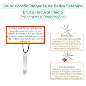 Colar Cordão Pingente de Pedra Selenita Bruta Natural Colar com pedra selenita bruta natural É uma peça de joalheria que combina estética e benefícios espirituais. A selenita é uma pedra de alta energia, conhecida por suas propriedades de purificação, cura e proteção. Quando Utilizado como pingente em um colar, ela não só serve como um acessório elegante, mas também como um amuleto de proteção e equilíbrio energético. Benefícios Energéticos: Purificação de Energia: A selenita é uma das pedras mais eficazes para a purificação energética. Ela ajuda a limpar energias negativas e a equilibrar o ambiente ao redor, criando uma aura de paz e tranquilidade. Proteção Espiritual: A selenita é considerada uma pedra protetora contra energias densas ou negativas. Usá-la no corpo pode formar um campo protetor ao redor da pessoa, afastando influências indesejadas. Enviamos a sua escultura em até 24 horas após a confirmação do pagamento Caso tenha alguma dúvida nos mande mensagem que responderemos rapidinho para te ajudar da melhor forma possível Marca: Não Informado Ean: 7894135848353