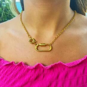 O colar com corrente de elo largo é um item completo que transforma composições simples em marcantes pelo seu fecho em boia com mosquetão.