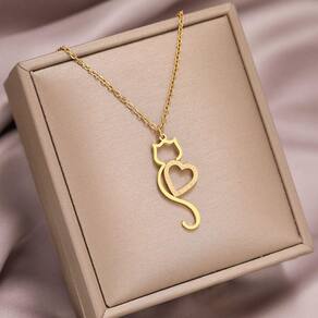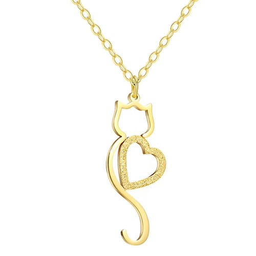 Colar feminino com pingente de gatinho e coração banhado a ouro 18k