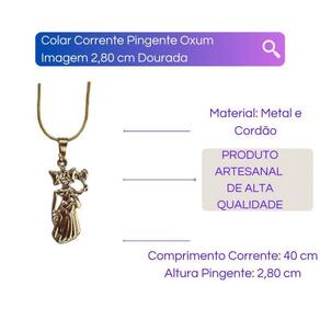 Colar Corrente Pingente Oxum Imagem 2,80 cm Dourada Colar Corrente Pingente Oxum Imagem 2,80 cm Dourada O Colar Corrente Pingente Oxum Imagem da Bialluz é banhado a ouro garantindo alta resistência e durabilidade. A corrente possui 40 cm de comprimento, mas é totalmente regulável podendo ser usada por qualquer pessoa, além de contar com um pingente maravilhoso que emanará ótimas energias em sua vida. É uma maravilhosa opção de presente, com certeza a pessoa que receberá sentirá muita gratidão por ter uma peça tão bela. Enviamos a sua corrente em até 24 horas após a confirmação de pagamento Dimensões aproximadas:Comprimento da corrente: 40 cmComprimento do pingente: 2,8 cm Material: Liga de Zinco em camadas Caso tenha alguma dúvida nos mande mensagem que respondemos rapidinho para te ajudar da melhor forma possível