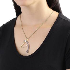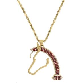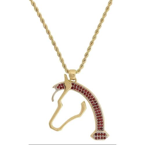 Colar Country Cabeça de Cavalo marca Espora Country, fabricado em Metal Nobre banhado com 10 milésimos de ouro 18K, possui pingente de Cabeça de Cavalo com pedras de Zircônia Vermelha, detalhes em banho prata e corrente torcida.