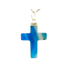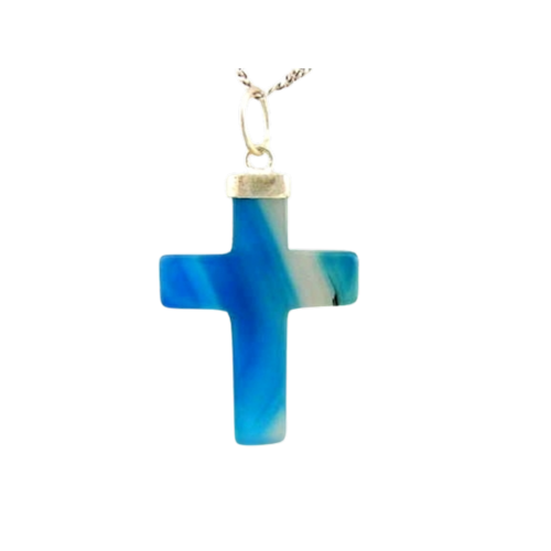 Colar Crucifixo de pedra agata natural, envolto em dourado, é um símbolo de força. Beleza e significado em uma só peça.