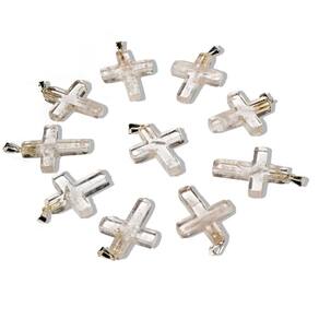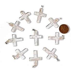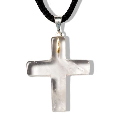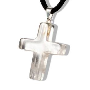 Tipo: Crucifixo artesanal em pedra natural Quartzo Cristal. Corte e Polimento: Lapidação em cruz com acabamento manual. Dimensões: 30 x 20 mm (tamanho médio, ideal para o uso). Peso: 10 quilates. Metal: Montagem com pino niquelado envolto em prata. Origem: Montagem artesanal em Curvelo, Minas Gerais, Brasil.