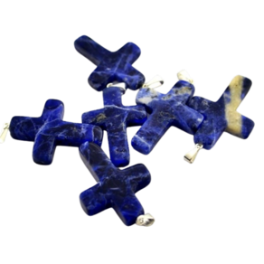 Crucifixo de pedra sodalita natural, envolto prateado, é um símbolo de proteção e elevação espiritual. Beleza e significado em uma só peça.