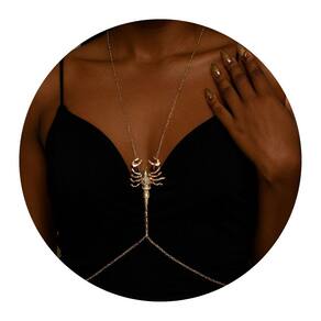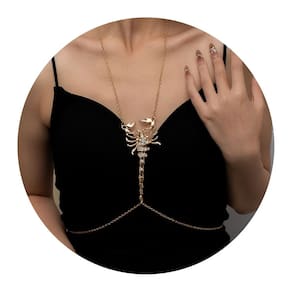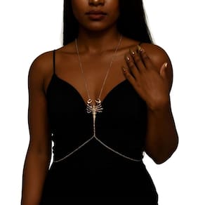 Destaque sua personalidade com este colar de corpo estiloso e ousado. Com design em formato de escorpião, acabamento dourado e aplicação de strass brilhantes, essa peça é perfeita para composições marcantes e sensuais.