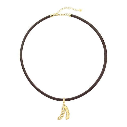 A VL accessoires traz à você o Colar de Couro Soja com 4 Pérolas que representam seus grãos. Elaborado em Couro Natural na cor marrom café, possui seus metais revestidos em Ouro!