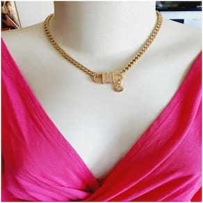 Colar de corrente e pingentes em metal dourado.