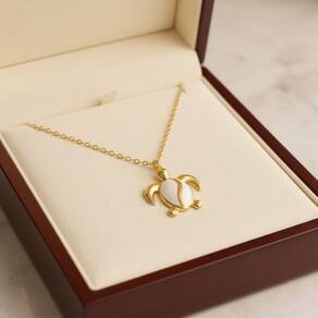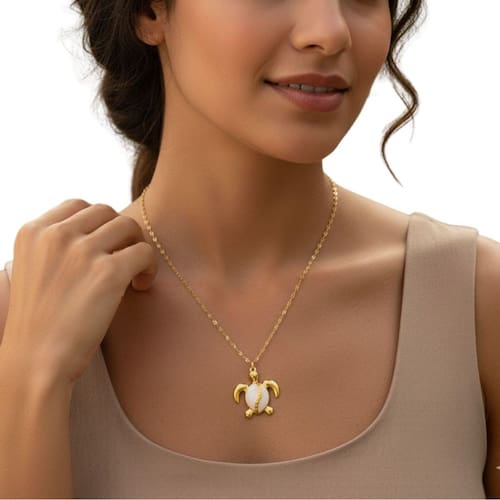 Colar elegante com pingente em formato de tartaruga, perfeito para quem ama acessórios com toque marinho e delicado. O pingente combina o dourado com detalhe branco central, destacando-se de forma charmosa e moderna. Ideal para uso diário ou para complementar looks de verão.