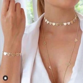 O colar Duplo Gargantilha e Corrente Corações é um acessório moderno e despojado, que traz personalidade e atitude para o look. Perfeito para quem gosta de estar sempre bem arrumada e na moda