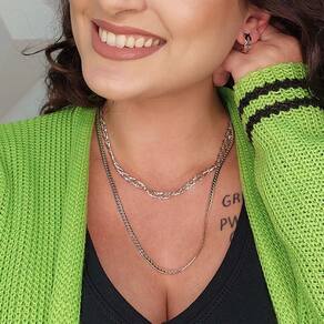 O Colar Duplo com Correntes Grossas é um acessório refinado e que transmite empoderamento para quem o usa. Além de completar sua coleção pessoal de joias com uma peça irradiante folheada em ródio.
