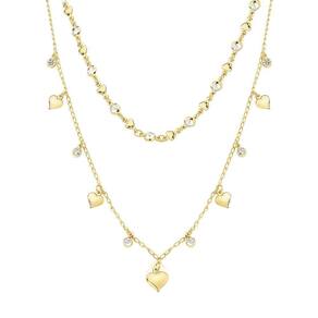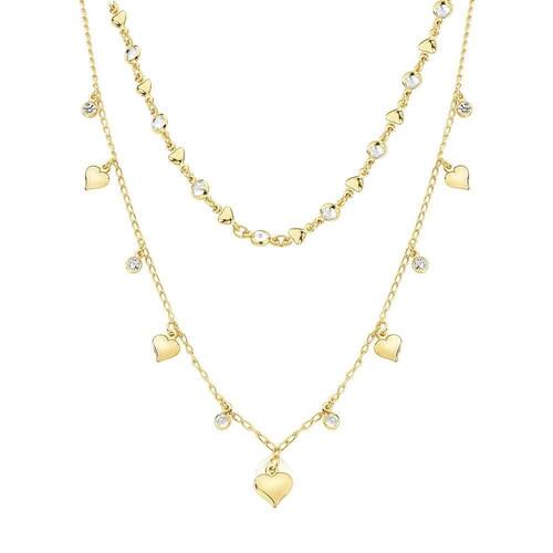 O Colar Duplo Corações e Cristais foi elaborado com 2 correntes em um fecho único e Revestimento em Ouro. A volta menor com 40cm intercala pequenos corações horizontais e cristais brancos. A volta maior, com 50cm possui uma corrente delicada de elos finos, com pingentes de corações e cristais, dando movimento à peça.