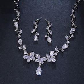 Colar e brinco banhados a ródio com pedras de zircônia.