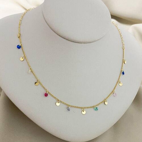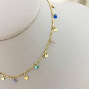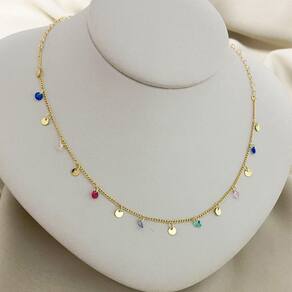 Colar Elo Redondo/Elo Coração com Bolinhas Chapadas e Pedras em Zircônia Colorida Banhado a Ouro