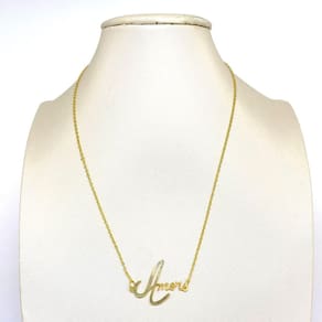 DESCRIÇÃO: Colar folheado a ouro escito Amor, essa peça foi escrita a mão e passada pela computador para dar um efeito diferente, dando um ar único e exclusivo para o colar, são peças atemporais e muito versáteis. O colar possui um design delicado e romântico, é um acessório desenvolvido para mulheres que gostam de estar deslumbrante independente da ocasião. É a responsável por dar charme e sofisticação para o visual, combinando com qualquer estilo DADOS TÉCNICOS: Tamanho de 45cm CARACTERÍSTICAS: Qualidade premium, banhado e desenvolvido com alta tecnologia que garante maior durabilidade e acabamento impecável. Tornando-se um diferencial no mercado. COMPOSIÇÃO: Confeccionado com principal matéria prima uma liga de metais nobres chamada Zamac zinco, magnésio, alumínio, cobre direto da fonte 100% pura que recebe o banho decorativo de ouro 18k em solução. Procedimento galvânico totalmente automatizado com brilho inigualável. Aplicação de verniz inovador de última geração. Garantindo excelência e alto padrão de qualidade em todas as peças. : de 3 meses. Validação da compra. A não cobre defeitos causados por mau uso. DICAS ÚTEIS A Farida Nesi Design oferece a melhor qualidade de acabamento. Cuidados simples preservam a beleza de suas joias por muito mais tempo. Para manter o brilho e qualidade que não use durante o banho, prática de esportes, ou atividades domésticas. Evite contato com água, e produtos químicos. Não passe perfume ou outros produtos sobre a peça. Limpe com uma flanela seca e macia. Guarde com cuidado. Todas as peças acompanham mini sacos ideais para serem armazenados. Compre agora Marca: Não Informado