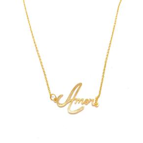 DESCRIÇÃO: Colar folheado a ouro escito Amor, essa peça foi escrita a mão e passada pela computador para dar um efeito diferente, dando um ar único e exclusivo para o colar, são peças atemporais e muito versáteis. O colar possui um design delicado e romântico, é um acessório desenvolvido para mulheres que gostam de estar deslumbrante independente da ocasião. É a responsável por dar charme e sofisticação para o visual, combinando com qualquer estilo DADOS TÉCNICOS: Tamanho de 45cm CARACTERÍSTICAS: Qualidade premium, banhado e desenvolvido com alta tecnologia que garante maior durabilidade e acabamento impecável. Tornando-se um diferencial no mercado. COMPOSIÇÃO: Confeccionado com principal matéria prima uma liga de metais nobres chamada Zamac zinco, magnésio, alumínio, cobre direto da fonte 100% pura que recebe o banho decorativo de ouro 18k em solução. Procedimento galvânico totalmente automatizado com brilho inigualável. Aplicação de verniz inovador de última geração. Garantindo excelência e alto padrão de qualidade em todas as peças. : de 3 meses. Validação da compra. A não cobre defeitos causados por mau uso. DICAS ÚTEIS A Farida Nesi Design oferece a melhor qualidade de acabamento. Cuidados simples preservam a beleza de suas joias por muito mais tempo. Para manter o brilho e qualidade que não use durante o banho, prática de esportes, ou atividades domésticas. Evite contato com água, e produtos químicos. Não passe perfume ou outros produtos sobre a peça. Limpe com uma flanela seca e macia. Guarde com cuidado. Todas as peças acompanham mini sacos ideais para serem armazenados. Compre agora Marca: Não Informado Ean: 7899472400288