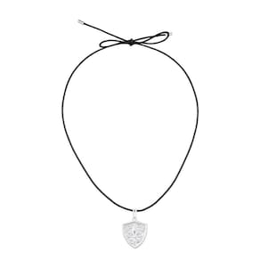 A VL traz esse símbolo cheio de significados, em um pingente em forma de escudo, acompanhado de cordão de algodão preto com ponteiras metálicas. Todos os metais foram revestidos em Prata.