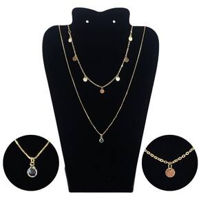A primeira camada do colar apresenta uma delicada corrente adornada com elos primorosamente desenhados, adicionando um toque de charme e feminilidade ao seu conjunto. Ele repousa graciosamente na clavícula, criando um ponto focal sutil, mas cativante.