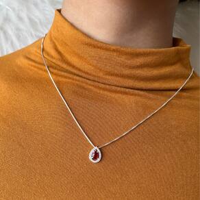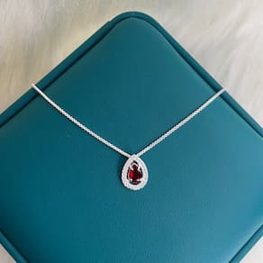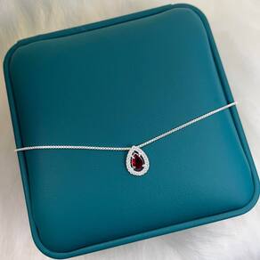 Material: Prata 925 Pedras: Brilhantes cuidadosamente cravejados ao redor de uma pedra central vermelho, criando um contraste encantador Design: Pingente em formato de gota que realça a beleza da pedra central e adiciona um toque de elegância