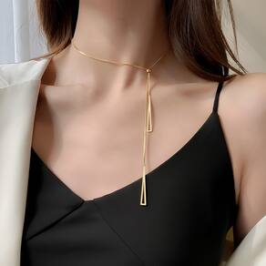 O colar feminino com dois pingentes geométricos em forma de triângulos estreitos é uma peça de joalheria moderna e elegante. Os triângulos, com suas linhas limpas e ângulos precisos, evocam uma sensação de equilíbrio e dinamismo, tornando este colar uma escolha perfeita para adicionar um toque de sofisticação geométrica a qualquer visual.