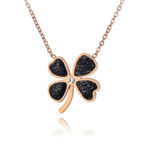 Especificações: Material: Aço Inoxidável Formato: Trevo de 4 folhas Cor: Preto e Prateado Banho: Ouro Rosê Fecho: Trava Lagosta Propriedades: Hipoalérgico