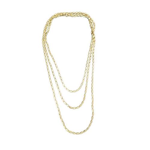 Seu design alongado permite diversas formas de uso, desde uma única volta para um toque clássico até múltiplas voltas para um visual mais moderno e texturizado. Este colar dourado com acabamento fosco oferece uma alternativa elegante ao brilho tradicional.