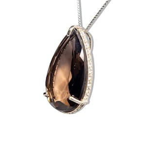 Pedra: Quartzo Fumê natural, com tonalidade marrom (foto ilustrativa) Corte: Gota Facetada, que reflete luz de maneira deslumbrante Claridade: Brilhoso e semi-transparente, com um brilho suave Medidas do Pingente: 30 x 18mm (aproximadamente) Montagem: Garra em Prata 950, envolto com zircônia branca para um toque adicional de brilho Peso Total da Joia: 10g (aproximadamente)